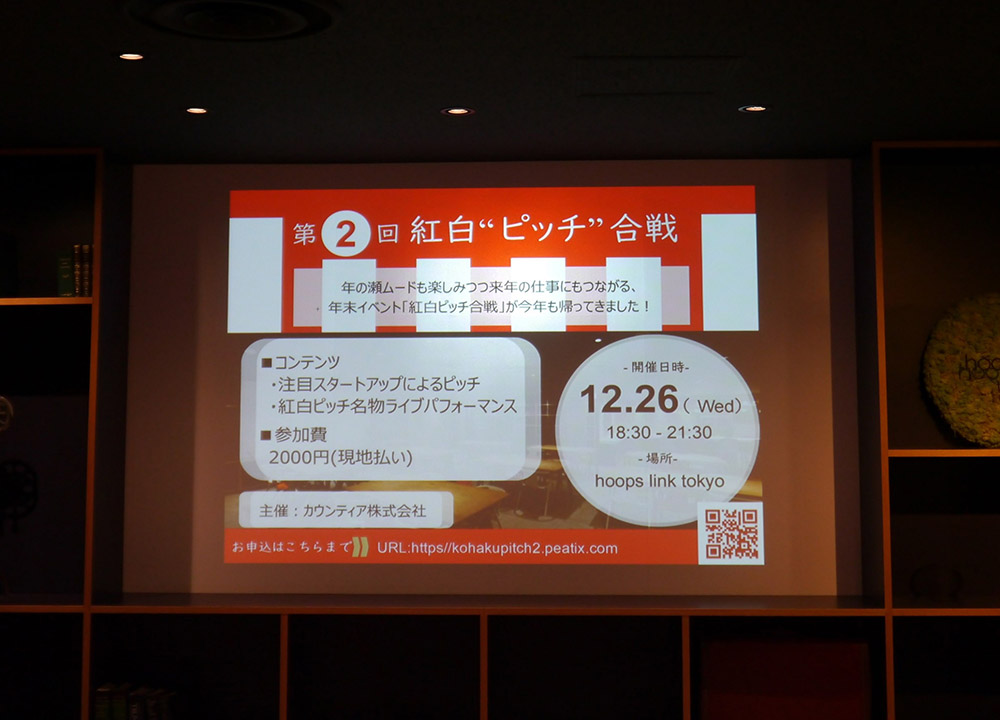 2018年12月26日、カウンティア株式会社主催の年末イベント「第2回紅白“ピッチ”合戦」が東京・渋谷のhoops link tokyoにて開催された。